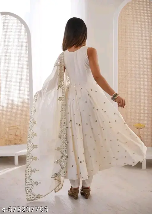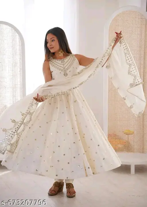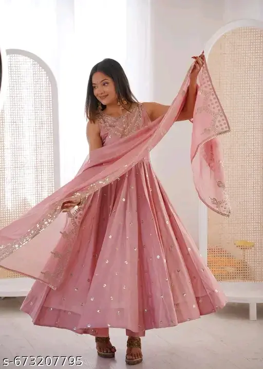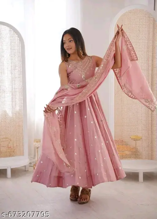 The gown features a flared silhouette with sequin embriodery scattered across the skirt and concentrated Around the neckline.